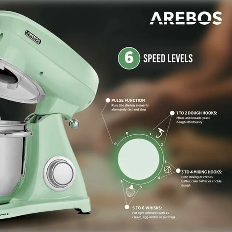 【Quick and convenient anti-slip design】The AREBOS food mixer includes several accessories: whisk, dough hook, and beater. The built-in blue LED light indicates the 6 different speed settings, such as for whisking eggs, kneading dough and many more functions. 4 anti-slip feet ensure quiet and secure footing during operation.