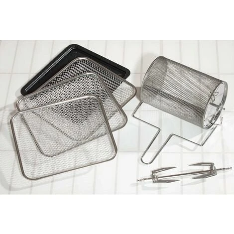 Includes a Rotisserie basket, rotisserie skewer a drip tray, a rotisserie removal tool and three mesh baskets