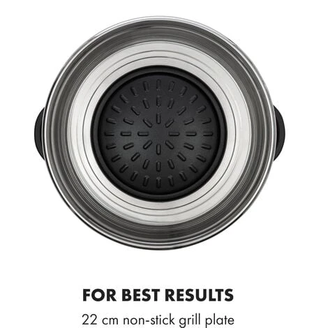 Equipped with a 38 cm diameter hot pot and a 22 cm grill plate, the Klarstein Szechuan hot pot with grill plate is ideal for preparing a variety of delicious soups, fondue, raclette, grilled meats, grilled vegetables, fish or seafood. The stainless steel pot with a total volume of 5 litres is supplied with the necessary heat by a 1350 watt aluminium heating element in low, medium and high levels. The centrally-oriented grill plate with non-stick coating and a power of 600 watts in two adjustable levels heats uniformly and makes every meal a true pleasure. Thanks to the dimpled surface, slipping of the food is prevented while the integrated drip tray reliably collects excess grease. Thanks to separately controllable heating circuits, both functional areas of the 2-in-1 unit can be controlled independently of each other and adjusted in terms of their heating output. Overheating protection also ensures automatic shutdown of the device if temperatures are too high. A lid made of toughened glass with a heat-resistant knob and two heat-resistant handles complete the safety features of the smart kitchen all-rounder.
