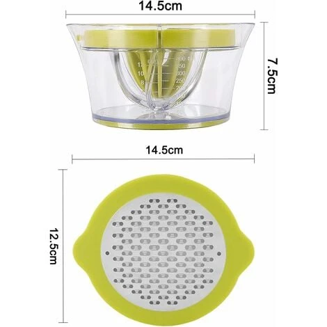 - 4 in 1 Orange Squeezer – The juicer consists of two reamers of different sizes, a grater and a 400ml fruit container. The transparent large reamer of the juicer is suitable for making orange juice and grapefruit juice; Small green orange juicer reamer is suitable for lemon and strained egg white. The diameter of the juicer is 14.5 cm, the height is 7.5 cm and the size of the grater is 14.5 x 12.5 cm. It can grind ginger and garlic into pieces.