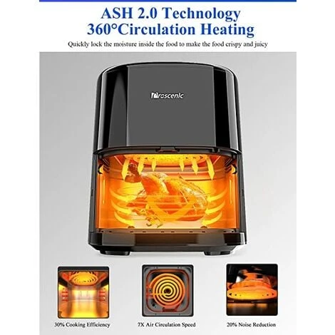 - [TurboAir Technology] With the aid of the TurboAir Technology which is 7 times more effective than regular air circulation technology, Proscenic T22 reduces 90% of fats contained in foods. The air fryer offers a 360° Steric Air Circulation that heats the food evenly, increasing the cooking efficiency by 30% while the nutrients are well retained. Subsequently, the foods are given a friable, brown color, making them look mouthwatering.
