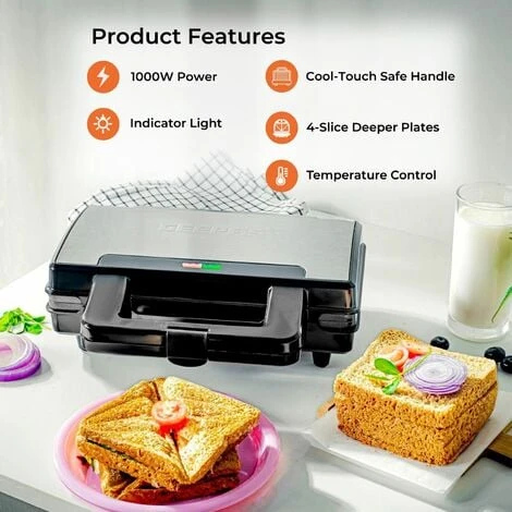 4-SLICE DEEPER SANDWICH PLATES, CUT & SEAL SYSTEM – It has deeper cooking plates, allowing for a more generous fill of your favourite ingredients! Their shape makes it easy to create a perfect seal, preventing the contents spilling out, to create 4 perfectly portioned sandwiches, Thick Grilled Cheese Toasties.
