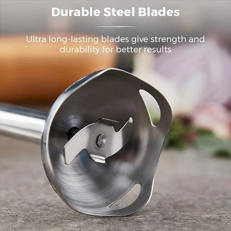 The stainless steel blades are strong and durable for long lasting performance. The head of the blender containing the blades is detachable for easy cleaning safely.